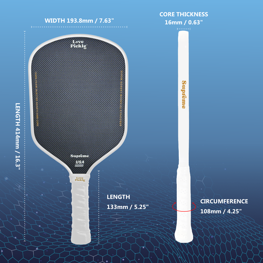 Take your game to the next level with the Love Pickle Titanium Supreme—a paddle designed for players who demand power, finesse, and durability in every shot. Featuring an Aerospace-Grade Blue Synthetic Polymer Microfibre Titanium* (PET) with a 3K Carbon Fibre Weave, this paddle delivers explosive power, enhanced spin, and pinpoint control. Its 16mm multi-layered foam-injected core expands the sweet spot for added stability, while the Carbon Titanium Friction Surface (CTFS) with Peel Ply Texture ensures superior grip and responsiveness.